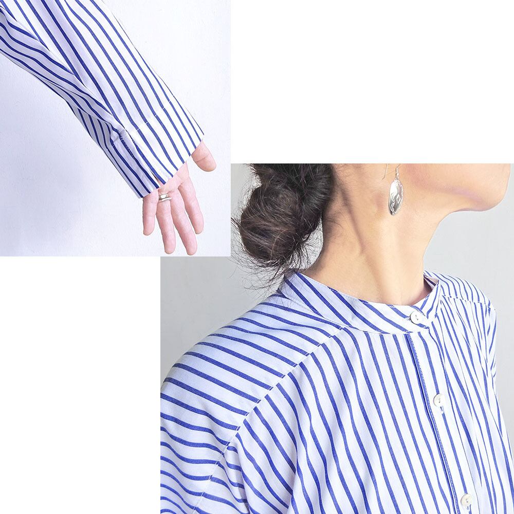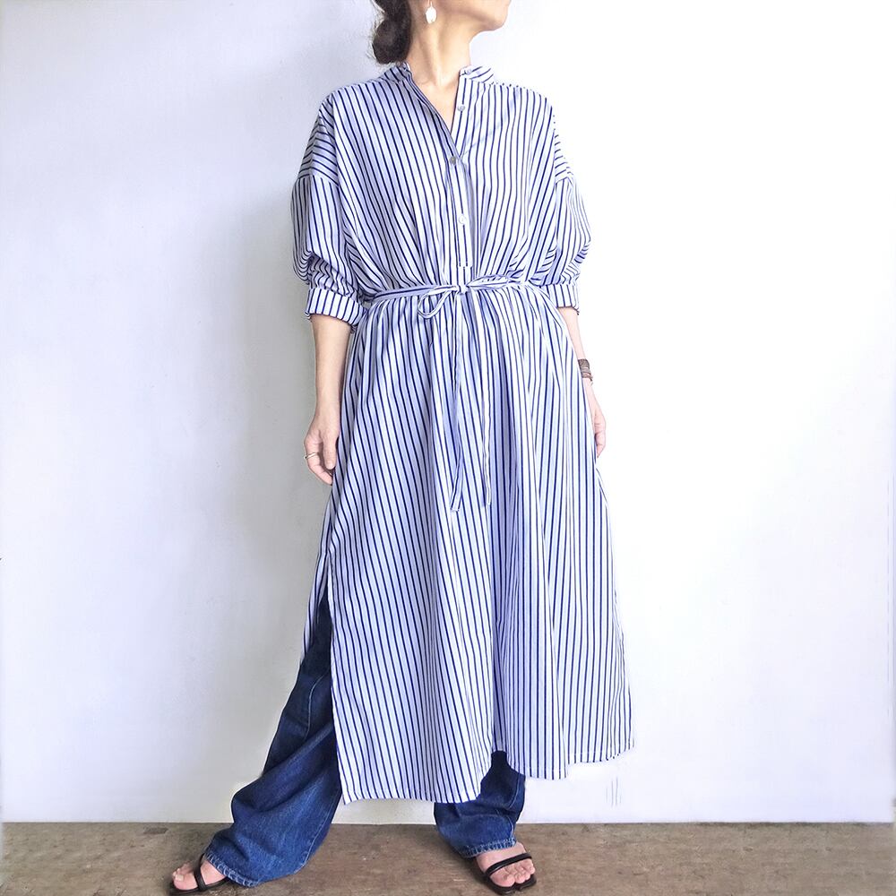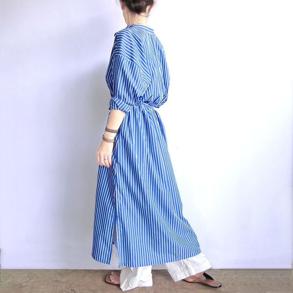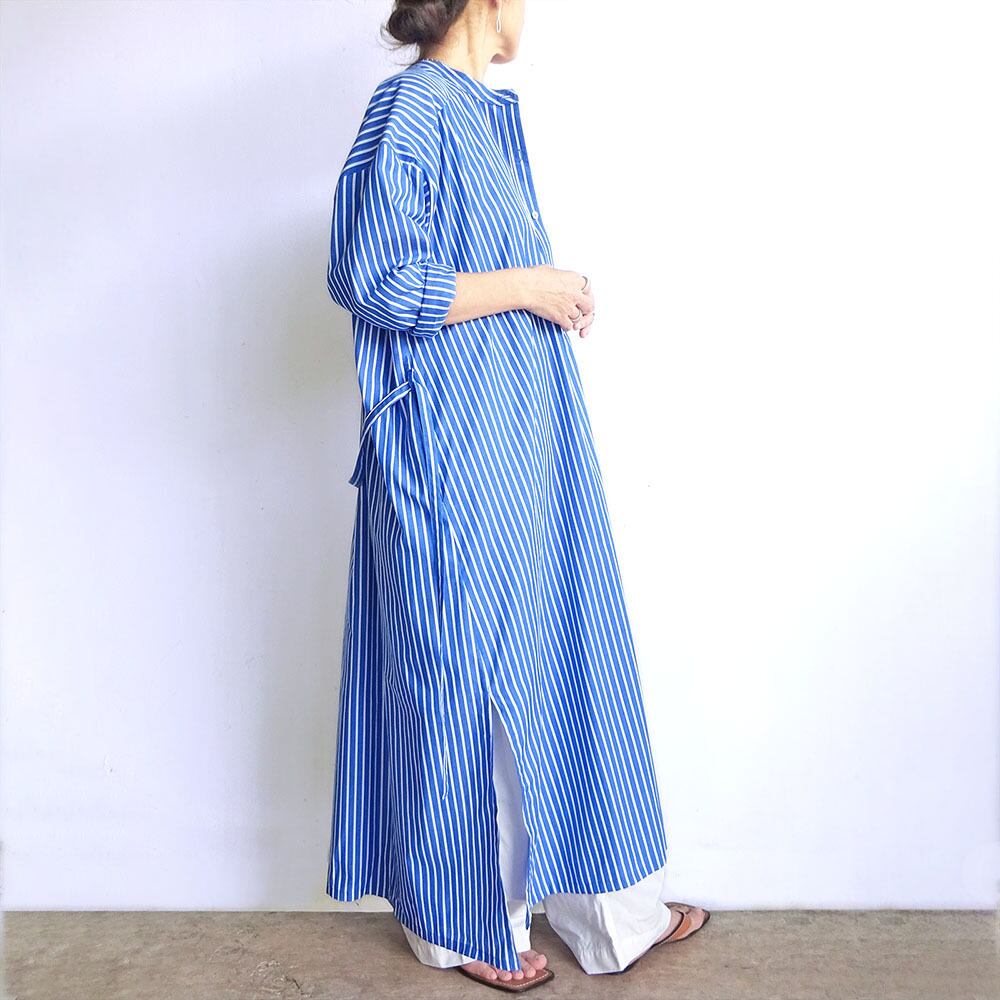 スタンドカラーロングワンピース(ストライプ青地×ホワイト)