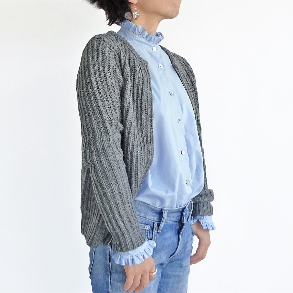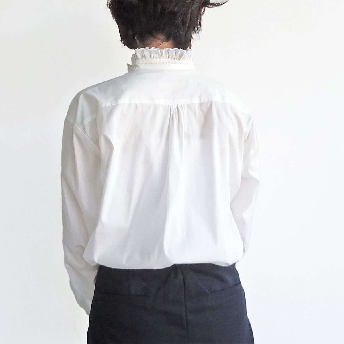 ベーシックなスタイルの中に襟と袖口のフリルで華やかさが加わった