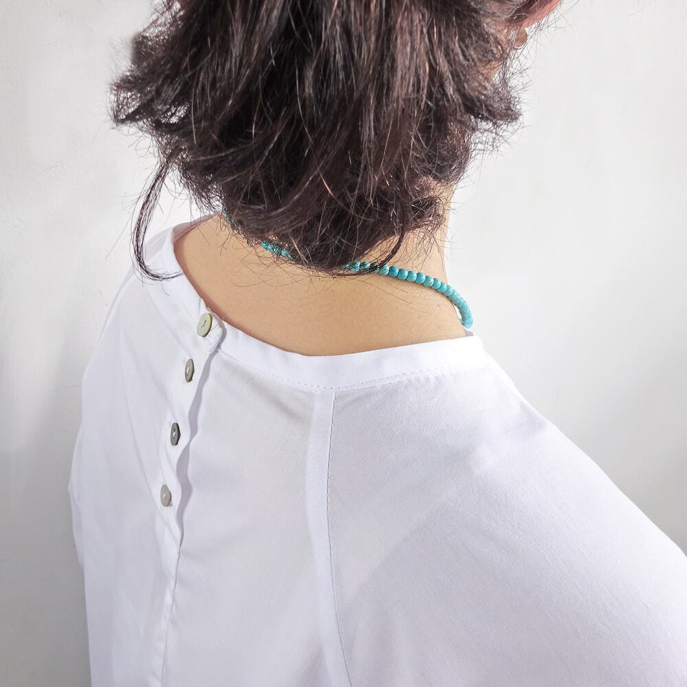 後ろ姿が可愛い襟ぐりにあしらった小さなバックボタンもポイント