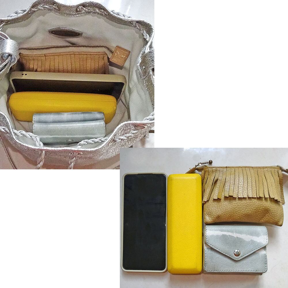 携帯電話、ミニ財布、ポーチ、眼鏡ケース、ハンカチ、ティッシュが入ります