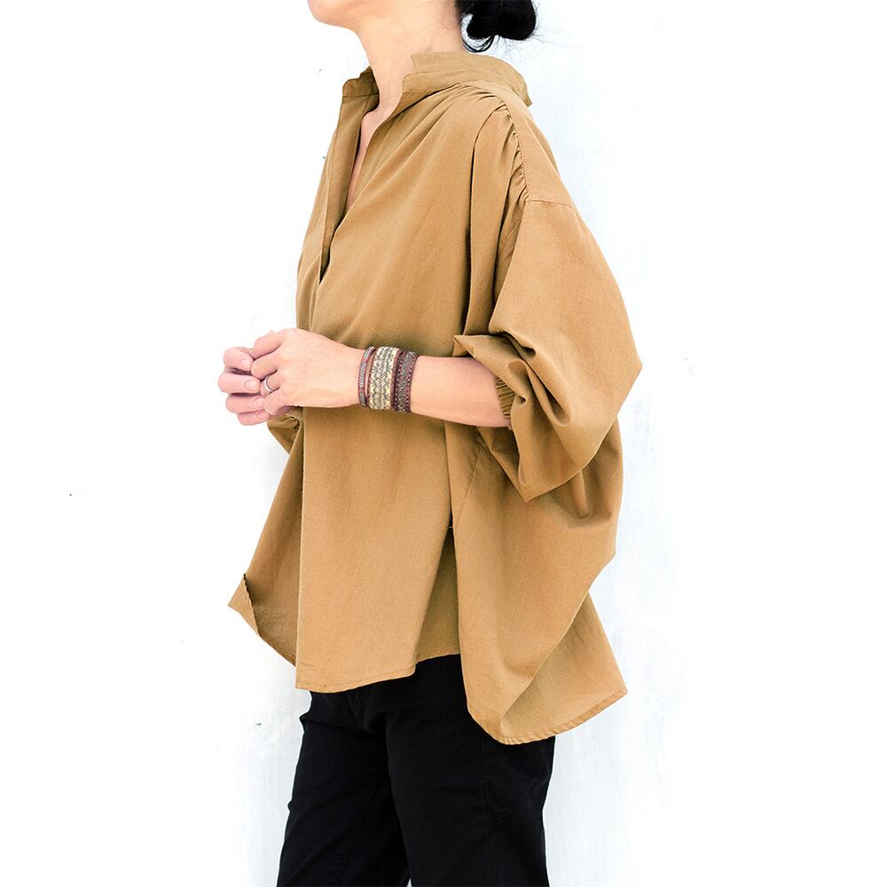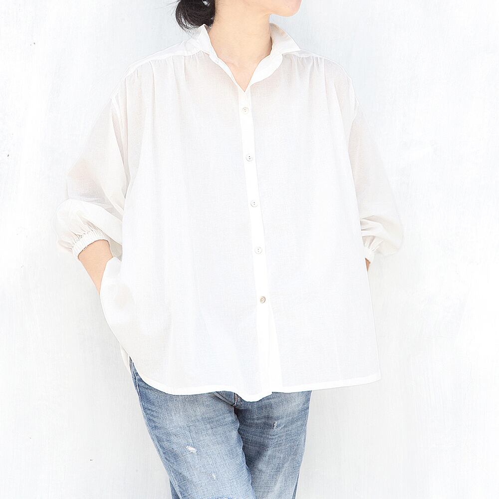 極薄で柔らかいコットンボイル素材でふんわり軽い着心地のギャザーブラウス