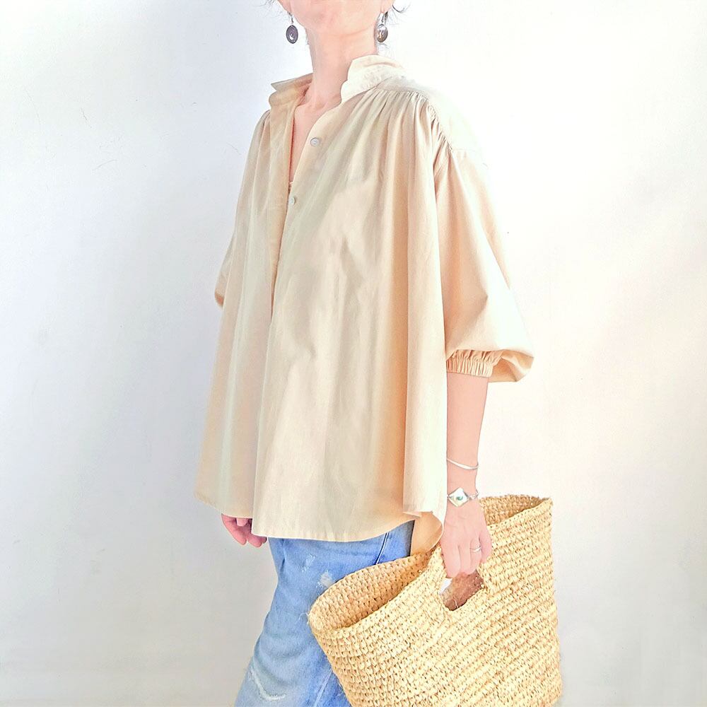 極薄で柔らかいコットンボイル素材でふんわり軽い着心地のギャザーブラウス