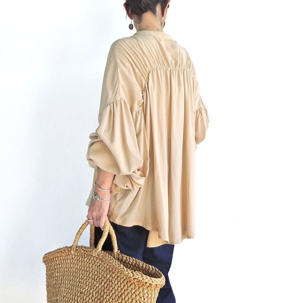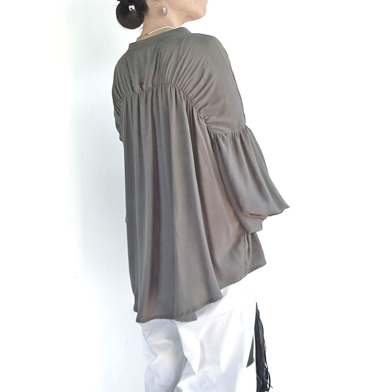 襟ぐりや袖にたっぷり入ったギャザーに加え