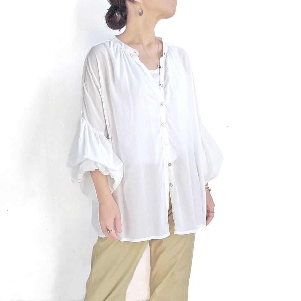 襟ぐりや袖にたっぷり入ったギャザーに加え